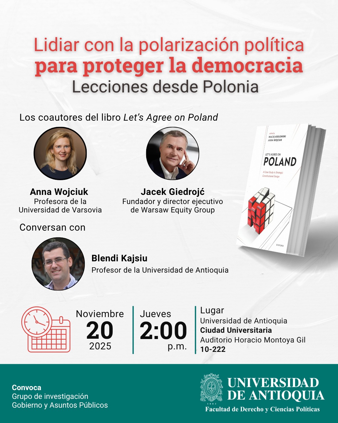 Durante este evento presentaremos el caso de la polarización política en Polonia y la propuesta para superar este estancamiento, tal como se expone en el libro Let’s Agree on Poland. Conocerán más sobre este país, cada vez más reconocido en Colombia, y sobre nuestra idea de un nuevo contrato social. A lo largo de la conferencia también haremos referencia a la experiencia de Colombia y a ciertas similitudes entre nuestros países, que existen a pesar de los contextos tan diferentes en los que vivimos.